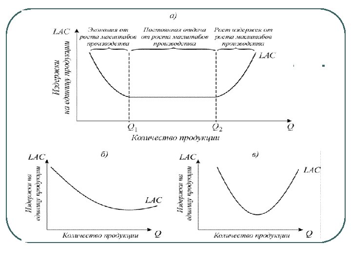 Издержки производства, характеризующие затраты факторов производства на единицу продукции в долгосрочном периоде, называются долгосрочными средними издержками (LAC). Зависимость между объемом выпуска и издержками производства в долгосрочном периоде описывается кривой долгосрочных средних издержек производства, которая показывает наименьшие издержки производства единицы продукции, с которыми может быть обеспечен любой объем производства.