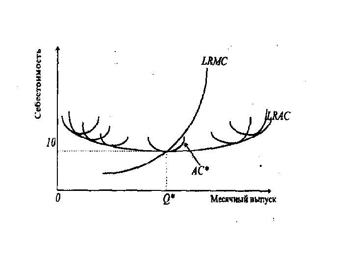 Кривая LAC огибает кривые средних краткосрочных издержек производства, касаясь их в точке их минимума.