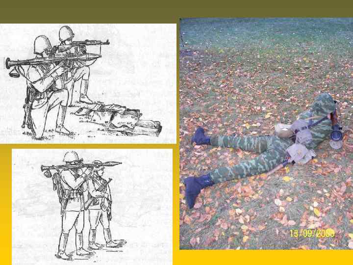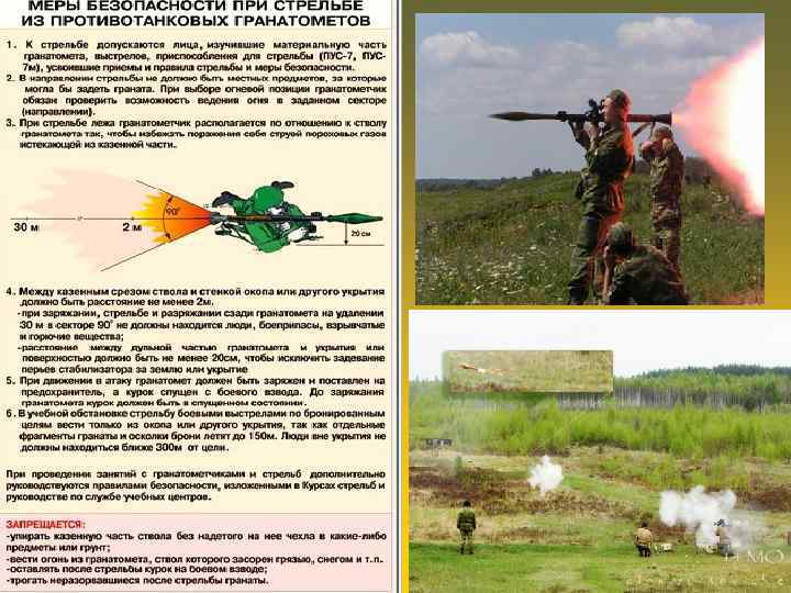 РПГ-7 В Требования безопасности 1) В учебной обстановке стрельбу боевыми гранатами по броне или танку вести только окопа или другого укрытия, так как осколки от брони, а также от самой гранаты в отдельных случаях летят на расстояние до 150 м; люди, находящиеся вне укрытия, должны быть не ближе 300 м от цели. 2) Следить за тем, чтобы при стрельбе из гранатомета сзади в створе с ним не находились ближе 30 м люди, боеприпасы, взрывчатые и горючие вещества; особо тщательно за выполнением этого требования необходимо следить при стрельбе ночью. 3) Во всех случаях ведения огня категорически запрещается: - упирать казенную часть гранатомета в какие-либо предметы или в грунт; между казенным срезом и стенкой окопа или другого укрытия должно быть расстояние не менее 2 м; - вести огонь из гранатомета, ствол которого засорен грязью, снегом и т. п. ; - допускать к стрельбе лиц, не имеющих твердых практических навыков в выполнении приемов стрельбы; - трогать неразорвавшиеся после стрельбы гранаты; такие гранаты подлежат уничтожению на месте их падения с соблюдением соответствующих правил предосторожности. 4) Дульная часть гранатомета при стрельбе должна находиться не ближе 20 см от бруствера или укрытия, чтобы исключить случаи задевания гранаты перьями стабилизатора за грунт и другие предметы. 5) При стрельбе лежа гранатометчик должен располагаться по отношению к стволу гранатомета так, чтобы избежать поражения себя пороховыми газами – вырывающимися из казенной части ствола при выстреле. 6) При ведении огня в песчаной или заболоченной местности и в снегу, гранаты, подготовленные для стрельбы, кладутся на сумку. Особенно необходимо