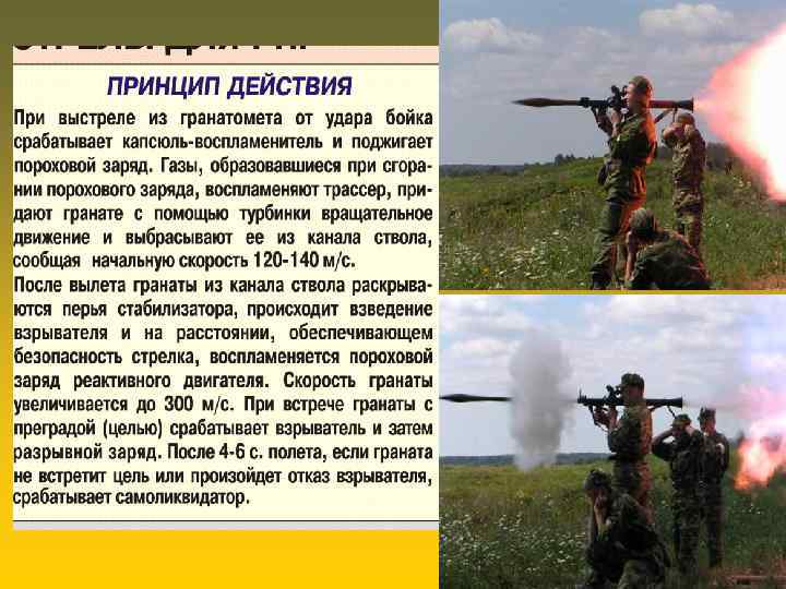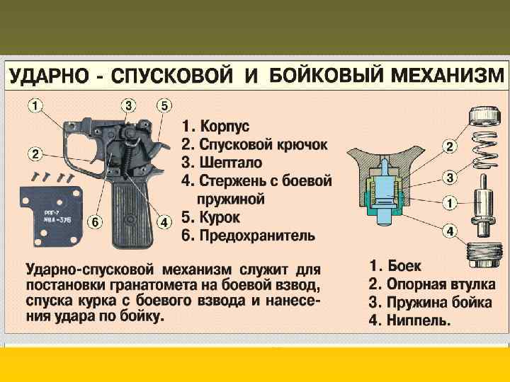 Работа частей, механизмов гранатомета и выстрела к нему. Принцип действия гранаты и взрывателя. • Принцип действия: при производстве выстрела, от удара бойка по капсюлю-воспламенителю гранаты воспламеняется пороховой заряд. Газы, образующиеся при сгорании порохового заряда, придают гранате вращательное движение и выбрасывает ее из канала ствола. После вылета гранаты из канала ствола открываются перья стабилизатора и, на расстоянии от 2, 5 до 18 м. , происходит взведение взрывателя. Через некоторое время начинает работу реактивный двигатель. При ударе о преграду или препятствие пьезоэлемент воспламеняет взрывчатое вещество. Образовавшиеся при взрыве узконаправленная струя пробивает металл и поражает личный состав ударной волной, высоким давлением и раскаленным металлом.