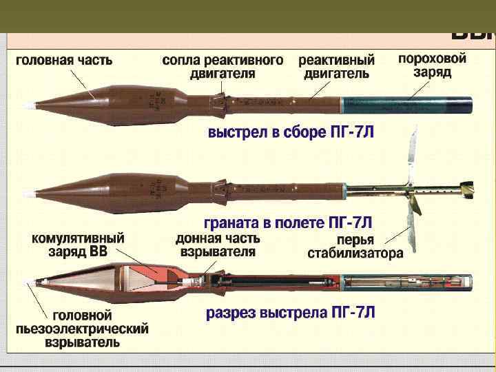 • Противотанковая реактивная граната ПГ-7 ВМ, вид в разрезе. • Противотанковая реактивная граната ПГ-7 ВЛ. • Противотанковая реактивная граната ПГ-7 ВР с тандемной боевой частью. • Термобарическая реактивная граната ТБГ-7 В (с БЧ объемного взрыва). • Осколочная (противопехотная) граната ОГ-7 В. ПГ-7 ВЛ ПГ-7 ВР ТБГ-7 В ОГ-7 В 1961 1977 1988 1999 Вес, кг 85 2. 2 93 2. 6 65 / 105 4. 5 40 2. 0 Эффективная дальность, м 500 200 350 Бронепробиваемость, мм 260 500 динамическая защита + более 600 - - Год принятия на вооружение Калибр БЧ, мм