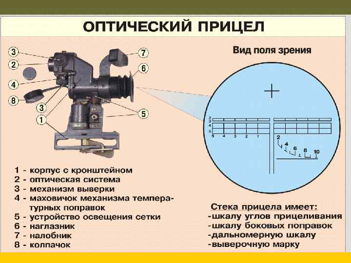 Оптический прицел ПГО-7 В Оптический прицел является основным прицелом гранатомета. ТТХ Оптический прицел состоит из 3 -х частей: МЕХАНИЧЕСКАЯ ОПТИЧЕСКАЯ ЭЛЕКТРИЧЕСКАЯ корпус кронштейн механизм выверки по горизонтали налобник тумблер маховик температурных поправок объектив призма сетка окуляр защитные стекла объектив и сетка лампочка батарейка