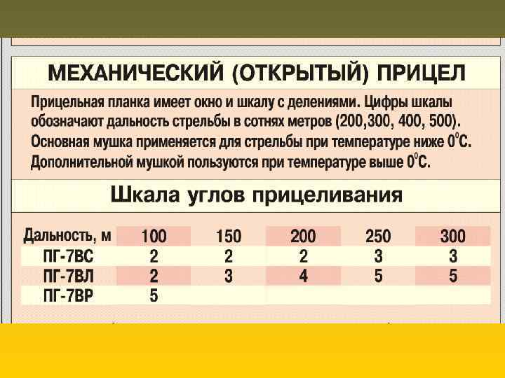 ИСХОДНЫЕ УСТАНОВКИ ПРИ СТРЕЛЬБЕ ИЗ ГРАНАТОМЕТА В НОРМАЛЬНЫХ (ТАБЛИЧНЫХ) УСЛОВИЯХ СТРЕЛЬБЫ. Деления шкалы прицела (установка прицела), как правило, выбираются соответственно определенному расстоянию до цели (например, для стрельбы по цели на расстоянии 400 м прицел 4). Точка прицеливания в этом случае выбирается в середине цели, а при стрельбе с использованием механического прицела гранатомета РПГ-7 прицеливание производить в верхнюю часть цели. В напряженные моменты боя по бронецелям, расположенным на дальностях прямого выстрела и ближе, огонь из РПГ-7 ведут с делением шкалы прицела 3, прицеливаясь в нижний край цели, а при использовании механического прицела в середину цели.