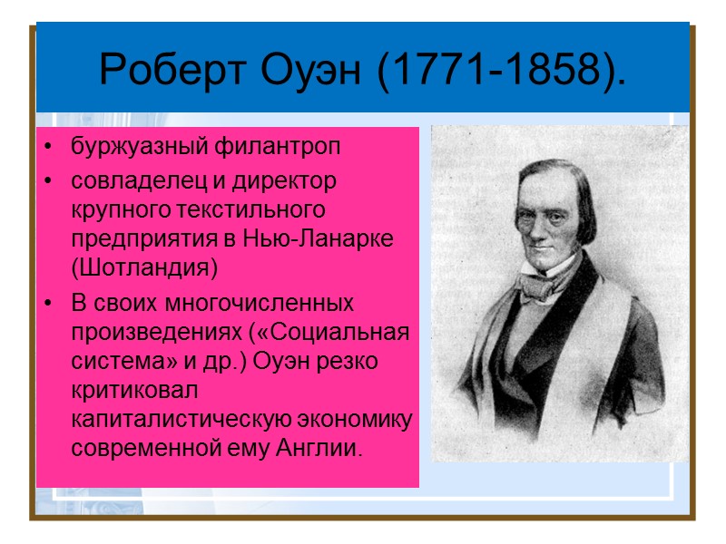 Клод Анри де Сен-Симон (1760-1825) Принадлежал к французской знати. К.А. Сен-Симон 3. Утопический социализм: А.Сен-Симон, Ш.Фурье, .Оуэн. Социалисты-рикардианцы. Считал недостатками капитализма: анархию производства, продажность чиновников, антидемократический характер парламентской системы. Утверждал, что в будущем обществе производство будет вестись по плану и обеспечивать благополучие народа.