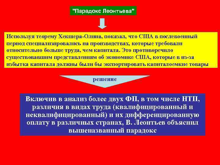 "Парадокс Леонтьева" Используя теорему Хекшера-Олина, показал, что США в послевоенный период специализировались на производствах, которые требовали относительно больше труда, чем капитала. Это противоречило существовавшим представлениям об экономике США, которые в из-за избытка капитала должны были бы экспортировать капиталоемкие товары решение Включив в анализ более двух ФП, в том числе НТП, различия в видах труда (квалифицированный и неквалифицированный) и их дифференцированную оплату в различных странах, В. Леонтьев объяснил вышеназванный парадокс
