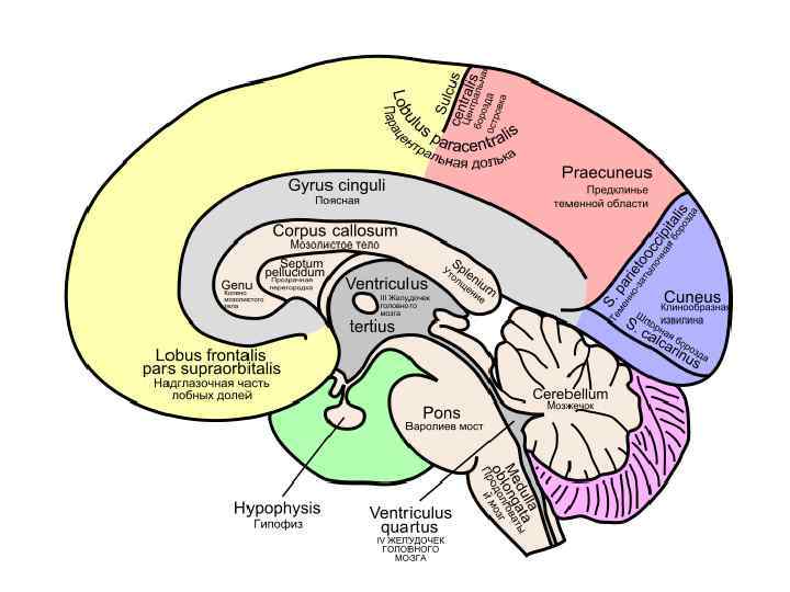 1. Полушарие большого мозга (конечный мозг) 2. Таламус (промежуточный мозг) 3. Гипоталамус (промежуточный мозг) 4. Средний мозг 5. Мост 6. Мозжечок 7. Продолговатый мозг 8. Спинной мозг
