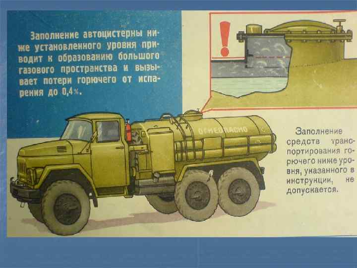 При организации налива, транспортирования и слива горючего автомобильными цистернами (АЦ) необходимо учитывать: -при нижнем сливе потери горючего сокращаются в три раза. - Остаток горючего, в АЦ должен быть не более 50 л, что равно примерно объему ее внутренних трубопроводных коммуникаций. - потери от неполного слива из-за неправильной установки АЦ с уклоном в сторону двигателя могут составлять от 5 до 30 л горючего.
