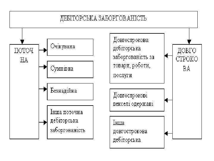 Класифікація ДЗ: 1. За строком погашення • Довгострокова • Поточна 2. За об’єктами • За фінансовою орендою, • Забезпечена векселем, • За товари, • За розрахунками, • Інша