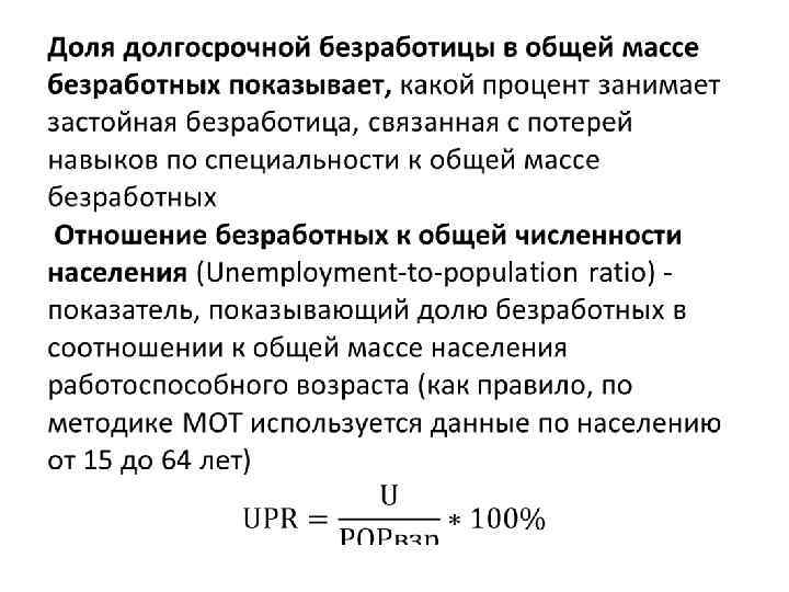 Безработица наличие в стране людей, составляющих часть экономически активного населения, которые способны и желают трудиться по найму, но не могут найти работу. POP = L + NL. POP Население страны L(labour force) включаемые в численность рабочей силы NL(non labour force ) и не включаемые в численность рабочей силы не занятые в общественном производстве и не стремящихся получить работу. В NL включаются: 1) Институциональное население: • дети до 16 лет; • лица, отбывающие срок заключения в тюрьмах; • люди, находящиеся в психиатрических лечебницах • инвалиды. 2)люди, которые в принципе могли бы трудиться, но не делают этого в силу разных причин, т. е. не хотят или не могут работать и работу не ищут: • студенты дневного отделения • вышедшие на пенсию • домохозяйки • бомжи • люди, прекратившие поиск работы (искавшие работу, но отчаявшиеся ее найти и