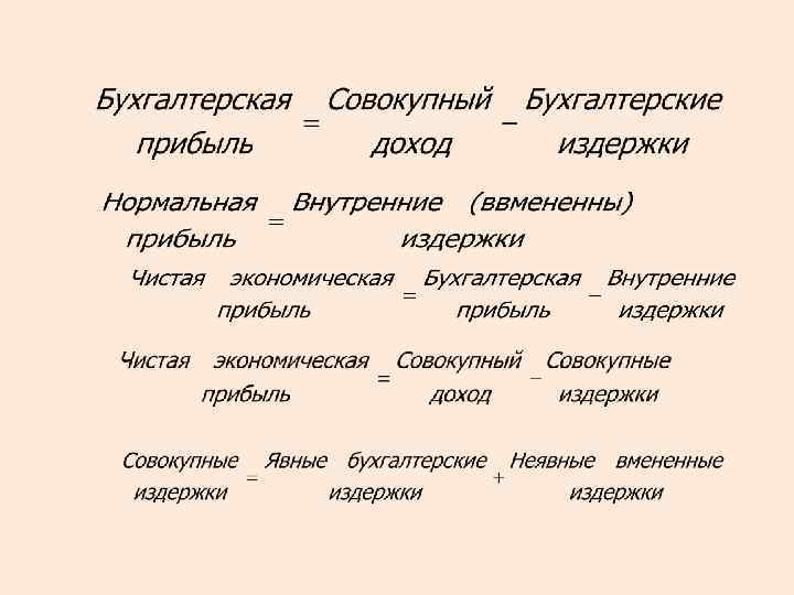 Бухгалтерская прибыль: совокупный доход – явные издержки Экономическая прибыль: совокупный доход – альтернативные издержки (явные + неявные)