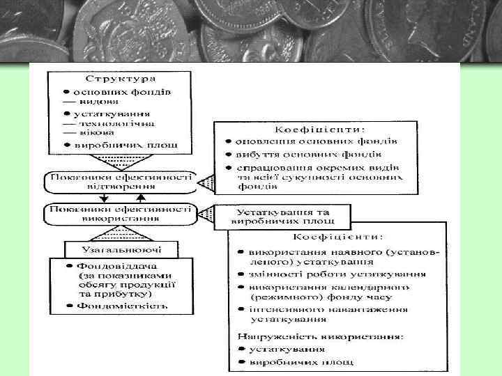 Видова (технологічна) структура основних засобів – співвідношення окремих видів (груп) основних засобів, виражене у відсотках до їхньої загальної вартості на підприємств. Вона змінюється під впливом факторів: v виробничо-технологічні особливості підприємства; v науково-технічний прогрес і зумовлений ним технічний рівень виробництва; v ступінь розвитку різних форм організації виробництва; v відтворювальна replicable reproducing структура капітальних вкладень у створення нових основних засобів; v вартість будівництва виробничих об'єктів і рівень цін на технологічне устаткування; v територіальне розміщення підприємства.