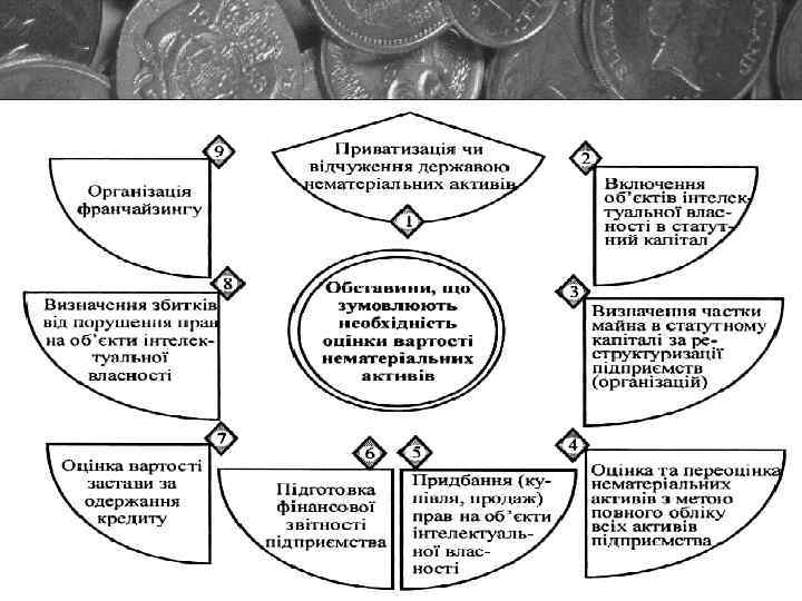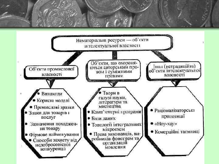 Нематеріальні активи — це категорія, яка виникає внаслідок володіння правами на об'єкти інтелектуальної власності або на обмежені ресурси та їхнього використання в господарській діяльності з отриманням доходу: ü права, що з'являються внаслідок володіння підприємством патентами, свідоцтвами; ü права, що виникають унаслідок володіння підприємством об'єктами авторського права та суміжних прав; ü права на використання створених на підприємстві нетрадиційних об'єктів інтелектуальної власності; ü права на користування земельними ділянками та природними ресурсами; ü монопольні права та привілеї на використання рідкісних ресурсів, ліцензії на здійснення певних видів діяльності; ü організаційні витрати на створення підприємства; ü права, що з'являються внаслідок укладених підприємством з іншими організаціями ліцензійних угод на використання об'єктів інтелектуальної власності.