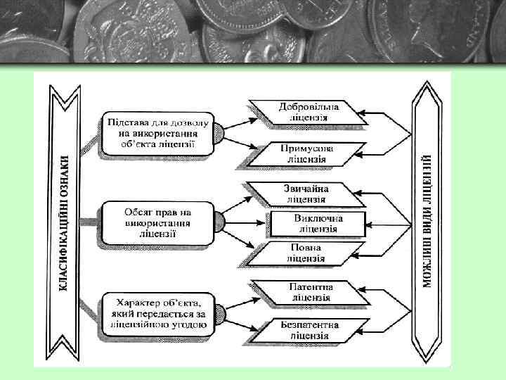 Ліцензія - дозвіл використовувати технічне досягнення або інший нематеріальний ресурс протягом певного строку за обумовлену винагороду. Ліцензійна угода — це договір, згідно з яким власник винаходу (ліцензіар) передає іншій стороні (ліцензіату) ліцензію на використання в певних межах своїх прав на патенти, «ноу-хау» , товарні знаки тощо.