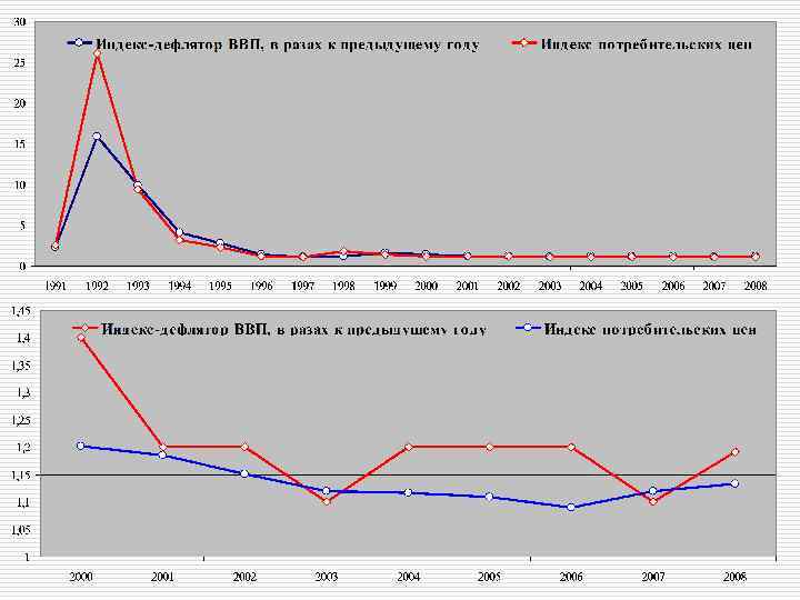 Следующая проблема измерителя – инфляция Номинальный и реальный ВВП 45000 40000 35000 млрд. руб. 30000 25000 20000 15000 10000 5000 0 2001 2002 ВВП (в текущих ценах) млрд. руб. 2003 2004 2005 2006 2007 ВВП (в ценах 2000 г. ) млрд. руб. 2008