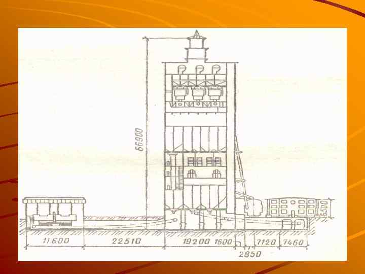 1 - робоча будівля (робоча вежа, висота 60 і більш метрів), 2 - силосний корпус - висота 10 -30 м, 3 - надсилосна галерея, 4 - підсилосная галерея, 5 - споруди для прийому і вивантаження зерна.