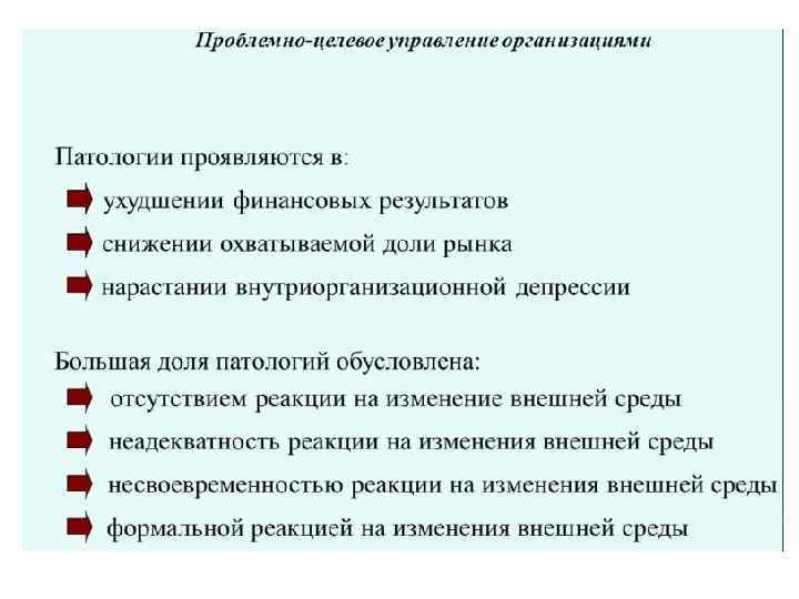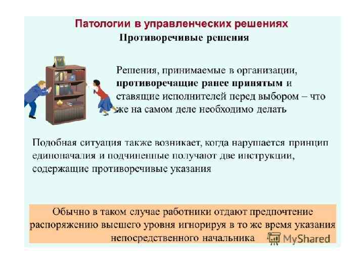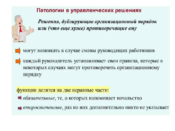 Патологии в УР Большинство патологий в принятии УР обусловлено: • Нарушением принципов управления • Отсутствием реакции на отклонения внутри организации • Несвоевременной, формальной, либо вовсе отсутствующей реакцией на изменения среды