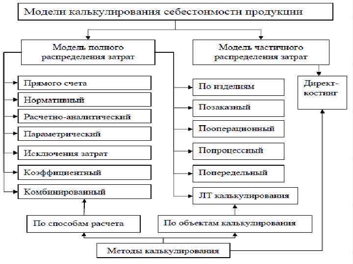 Классификация методов учета затрат и калькулирования себестоимости продукции Признак Объекты калькулирования Метод учета затрат Позаказный метод Попроцессный метод Степень Система фактических нормирования затрат Система нормативных затрат Полнота охвата затрат Система полных затрат Система частичных затрат