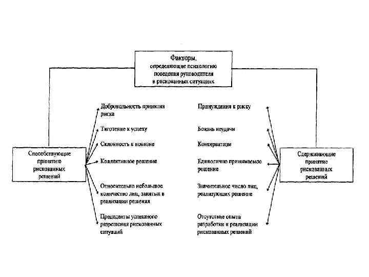 Основные тенденции принятия рискованных решений: • менеджеры старшего возраста, а также люди, проработавшие в фирме продолжительное время, склонны избегать риска; • менеджеры с более высоким статусом, большей властью и большими доходами, а также работающие в небольших фирмах, рискуют чаще; • более высокий уровень образования менеджеров увеличивает склонность к риску; • люди скорее пойдут на риск, уже находясь в рискованной ситуации, чем выйдут из нее; • банковское дело привлекает значительно больше рискованных менеджеров, чем другие отрасли промышленности; • решения, связанные с бизнесом фирм, рискованнее тех, что касаются персонального дохода предпринимателя (менеджер скорее рискнет деньгами фирмы, чем своим доходом).