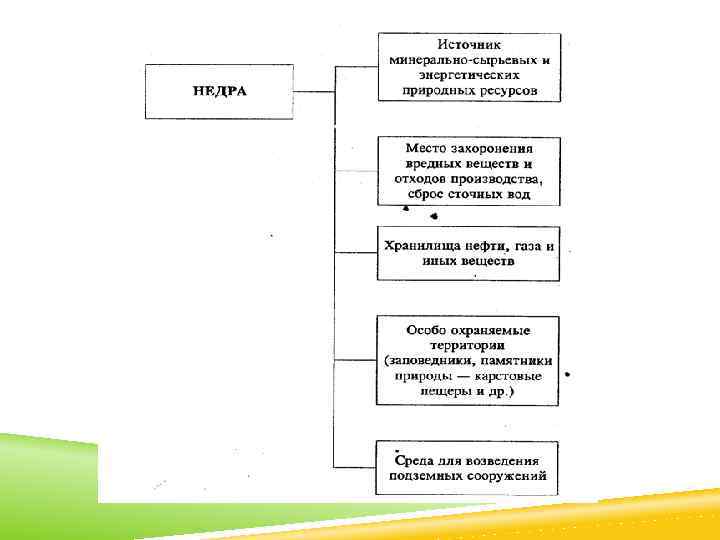 6. ОХРАНА НЕДР от истощения запасов полезных ископаемых и загрязнения Согласно действующему законодательству для предотвращения экологического и экономического вреда недрам необходимо: 1. обеспечивать полное и комплексное геологическое изучение недр; 2. соблюдать установленный порядок пользования недр и не допускать самовольное пользование недрами; 3. наиболее полно извлекать из недр и рационально использовать запасы основных полезных ископаемых и попутных компонентов; 4. не допускать вредного влияния работ, связанных с пользованием недрами, на сохранность запасов полезных ископаемых; 5. охранять месторождения полезных ископаемых от затопления, обводнения, пожаров и др. ; 6. предупреждать самовольную и необоснованную застройку площадей залегания полезных ископаемых; 7. предотвращать загрязнение недр при подземном хранении нефти, газа и иных веществ, захоронении вредных веществ и отходов производства.