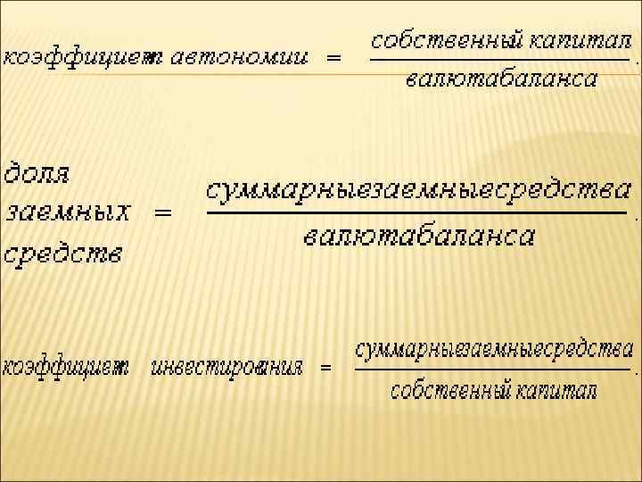 Отчетность позволяет определить: • общую стоимость имущества предприятия, • стоимость иммобилизованных (т. е. основных и прочих внеоборотных) средств, • стоимость мобильных (оборотных) средств, • материальных оборотных средств, • величину собственных и заемных средств предприятия.