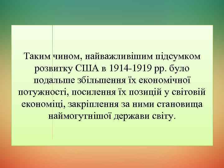 Таким чином, найважливішим підсумком розвитку США в 1914 -1919 pp. було подальше збільшення їх економічної потужності, посилення їх позицій у світовій економіці, закріплення за ними становища наймогутнішої держави світу.