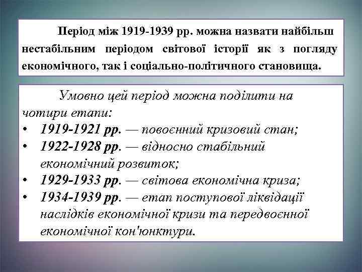 Період між 1919 -1939 pp. можна назвати найбільш нестабільним періодом світової історії як з погляду економічного, так і соціально-політичного становища. Умовно цей період можна поділити на чотири етапи: • 1919 -1921 pp. — повоєнний кризовий стан; • 1922 -1928 pp. — відносно стабільний економічний розвиток; • 1929 -1933 pp. — світова економічна криза; • 1934 -1939 рр. — етап поступової ліквідації наслідків економічної кризи та передвоєнної економічної кон'юнктури.