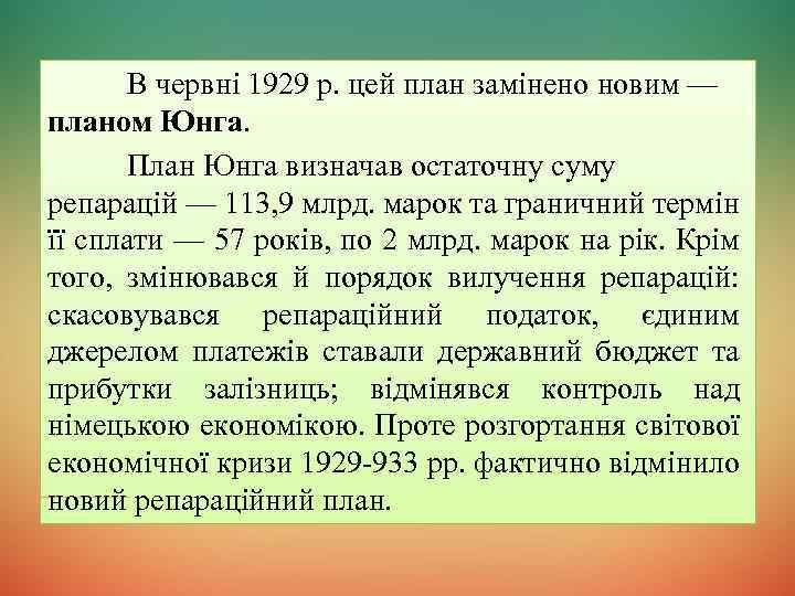 В червні 1929 р. цей план замінено новим — планом Юнга. План Юнга визначав остаточну суму репарацій — 113, 9 млрд. марок та граничний термін її сплати — 57 років, по 2 млрд. марок на рік. Крім того, змінювався й порядок вилучення репарацій: скасовувався репараційний податок, єдиним джерелом платежів ставали державний бюджет та прибутки залізниць; відмінявся контроль над німецькою економікою. Проте розгортання світової економічної кризи 1929 -933 рр. фактично відмінило новий репараційний план.