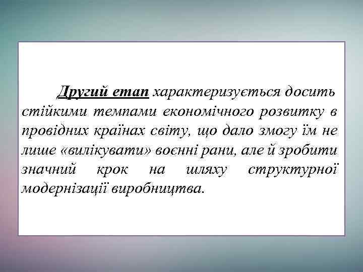 Другий етап характеризується досить стійкими темпами економічного розвитку в провідних країнах світу, що дало змогу їм не лише «вилікувати» воєнні рани, але й зробити значний крок на шляху структурної модернізації виробництва.