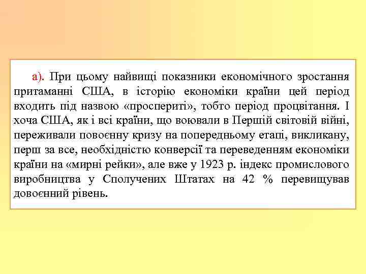 а). При цьому найвищі показники економічного зростання притаманні США, в історію економіки країни цей період входить під назвою «проспериті» , тобто період процвітання. І хоча США, як і всі країни, що воювали в Першій світовій війні, переживали повоєнну кризу на попередньому етапі, викликану, перш за все, необхідністю конверсії та переведенням економіки країни на «мирні рейки» , але вже у 1923 р. індекс промислового виробництва у Сполучених Штатах на 42 % перевищував довоєнний рівень.