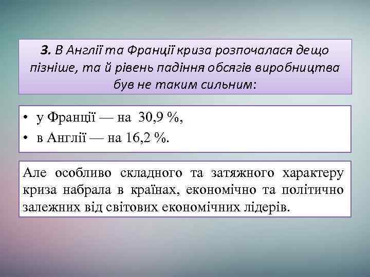 3. В Англії та Франції криза розпочалася дещо пізніше, та й рівень падіння обсягів виробництва був не таким сильним: • у Франції — на 30, 9 %, • в Англії — на 16, 2 %. Але особливо складного та затяжного характеру криза набрала в країнах, економічно та політично залежних від світових економічних лідерів.