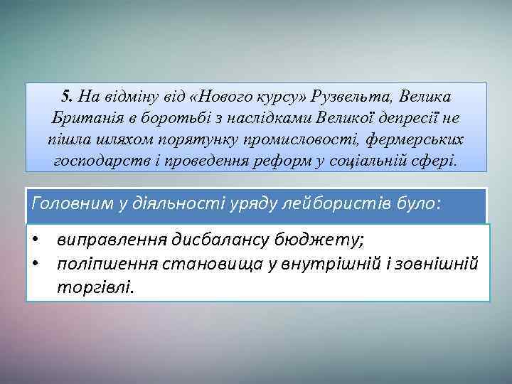 5. На відміну від «Нового курсу» Рузвельта, Велика Британія в боротьбі з наслідками Великої депресії не пішла шляхом порятунку промисловості, фермерських господарств і проведення реформ у соціальній сфері. Головним у діяльності уряду лейбористів було: • виправлення дисбалансу бюджету; • поліпшення становища у внутрішній і зовнішній торгівлі.