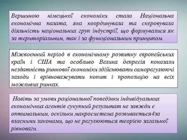 Вершиною німецької економіки стала Національна економічна палата, яка координувала та скеровувала діяльність національних груп індустрії, що формувалися як за територіальним, так і за функціональним принципом. Міжвоєнний період в економічному розвитку європейських країн і США та особливо Велика депресія показали нездатність ринкової економіки здійснювати саморегулюючі заходи і врівноважувати попит і пропозицію на всіх можливих ринках. Навіть за умови раціональної поведінки індивідуальних економічних агентів сукупний результат не завжди є оптимальним, оскільки макросистема розвивається 4 за власними законами, що не регулюються теорією загальної рівноваги.