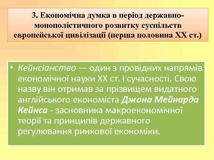 3. Економічна думка в період державномонополістичного розвитку суспільств европейської цивілізації (перша половина ХХ ст. ) • Кейнсіанство — один з провідних напрямів економічної науки XX ст. і сучасності. Свою назву він отримав за прізвищем видатного англійського економіста Джона Мейнарда Кейнса - засновника макроекономічної теорії та принципів державного регулювання ринкової економіки.