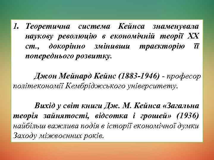 1. Теоретична система Кейнса знаменувала наукову революцію в економічній теорії XX ст. , докорінно змінивши траєкторію її попереднього розвитку. Джон Мейнард Кейнс (1883 -1946) - професор політекономії Кембріджського університету. Вихід у світ книги Дж. М. Кейнса «Загальна теорія зайнятості, відсотка і грошей» (1936) найбільш важлива подія в історії економічної думки Заходу міжвоєнних років.