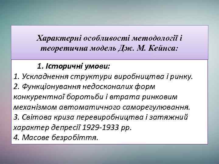 Характерні особливості методології і теоретична модель Дж. М. Кейнса: 1. Історичні умови: 1. Ускладнення структури виробництва і ринку. 2. Функціонування недосконалих форм конкурентної боротьби і втрата ринковим механізмом автоматичного саморегулювання. 3. Світова криза перевиробництва і затяжний характер депресії 1929 -1933 рр. 4. Масове безробіття.