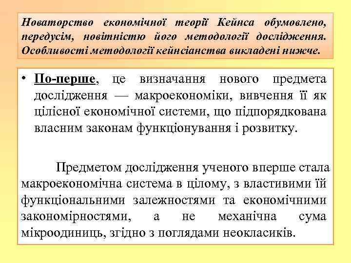 Новаторство економічної теорії Кейнса обумовлено, передусім, новітністю його методології дослідження. Особливості методології кейнсіанства викладені нижче. • По-перше, це визначання нового предмета дослідження — макроекономіки, вивчення її як цілісної економічної системи, що підпорядкована власним законам функціонування і розвитку. Предметом дослідження ученого вперше стала макроекономічна система в цілому, з властивими їй функціональними залежностями та економічними закономірностями, а не механічна сума мікроодиниць, згідно з поглядами неокласиків.