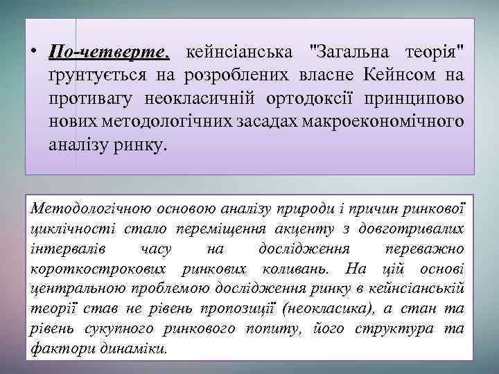 • По-четверте, кейнсіанська "Загальна теорія" ґрунтується на розроблених власне Кейнсом на противагу неокласичній ортодоксії принципово нових методологічних засадах макроекономічного аналізу ринку. Методологічною основою аналізу природи і причин ринкової циклічності стало переміщення акценту з довготривалих інтервалів часу на дослідження переважно короткострокових ринкових коливань. На цій основі центральною проблемою дослідження ринку в кейнсіанській теорії став не рівень пропозиції (неокласика), а стан та рівень сукупного ринкового попиту, його структура та фактори динаміки.