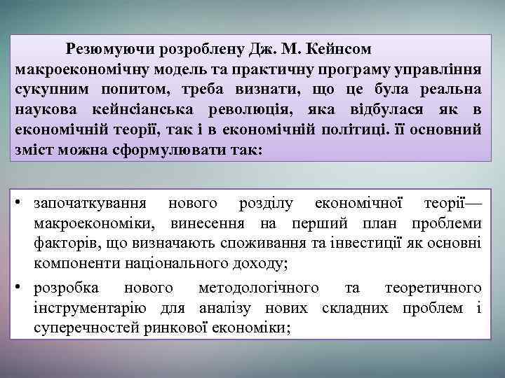 Резюмуючи розроблену Дж. М. Кейнсом макроекономічну модель та практичну програму управління сукупним попитом, треба визнати, що це була реальна наукова кейнсіанська революція, яка відбулася як в економічній теорії, так і в економічній політиці. її основний зміст можна сформулювати так: • започаткування нового розділу економічної теорії— макроекономіки, винесення на перший план проблеми факторів, що визначають споживання та інвестиції як основні компоненти національного доходу; • розробка нового методологічного та теоретичного інструментарію для аналізу нових складних проблем і суперечностей ринкової економіки;