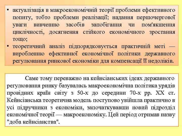 • актуалізація в макроекономічній теорії проблеми ефективного попиту, тобто проблеми реалізації; надання першочергової уваги вивченню засобів запобігання чи пом'якшення циклічності, досягнення стійкого економічного зростання тощо; • теоретичний аналіз підпорядковується практичній меті — виробленню ефективної економічної політики державного регулювання ринкової економіки для компенсації її недоліків. Саме тому переважно на кейнсіанських ідеях державного регулювання ринку базувалась макроекономічна політика урядів провідних країн світу з 50 -х до середини 70 -х рр. XX ст. Кейнсіанська теоретична модель поступово увійшла практично в усі підручники з економіки, започаткувавши новий підрозділ економічної теорії — макроекономіку. Цей період отримав назву "доба кейнсіанства".