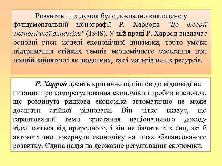 Розвиток цих думок було докладно викладено у фундаментальній монографії Р. Харрода "До теорії економічної динаміки" (1948). У цій праці Р. Харрод визначає основні риси моделі економічної динаміки, тобто умови підтримання стійких темпів економічного зростання при повній зайнятості як людських, так і матеріальних ресурсів. Р. Харрод досить критично підійшов до відповіді на питання про саморегулювання економіки і зробив висновок, що розвинута ринкова економіка автоматично не може досягати стійкої рівноваги. Він чітко вказує, що гарантований темп зростання національного доходу відхиляється від природного, і він не бачить тих сил, які б автоматично повернули економіку на шлях збалансованого розвитку. Єдина надія на державне регулювання економіки.