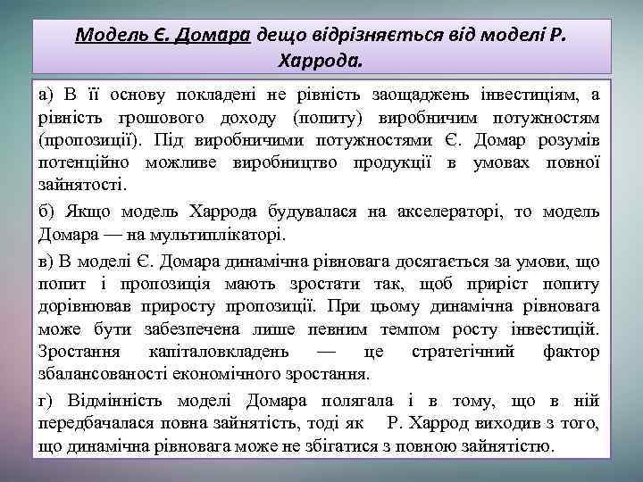Модель Є. Домара дещо відрізняється від моделі Р. Харрода. а) В її основу покладені не рівність заощаджень інвестиціям, а рівність грошового доходу (попиту) виробничим потужностям (пропозиції). Під виробничими потужностями Є. Домар розумів потенційно можливе виробництво продукції в умовах повної зайнятості. б) Якщо модель Харрода будувалася на акселераторі, то модель Домара — на мультиплікаторі. в) В моделі Є. Домара динамічна рівновага досягається за умови, що попит і пропозиція мають зростати так, щоб приріст попиту дорівнював приросту пропозиції. При цьому динамічна рівновага може бути забезпечена лише певним темпом росту інвестицій. Зростання капіталовкладень — це стратегічний фактор збалансованості економічного зростання. г) Відмінність моделі Домара полягала і в тому, що в ній передбачалася повна зайнятість, тоді як Р. Харрод виходив з того, що динамічна рівновага може не збігатися з повною зайнятістю.