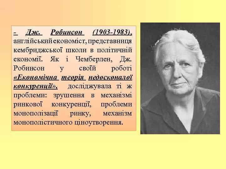 - Дж. Робинсон (1903 -1983), англійський економіст, представниця кембриджської школи в політичній економії. Як і Чемберлен, Дж. Робинсон у своїй роботі «Економічна теорія недосконалої конкуренції» , досліджувала ті ж проблеми: зрушення в механізмі ринкової конкуренції, проблеми монополізації ринку, механізм монополістичного ціноутворення.