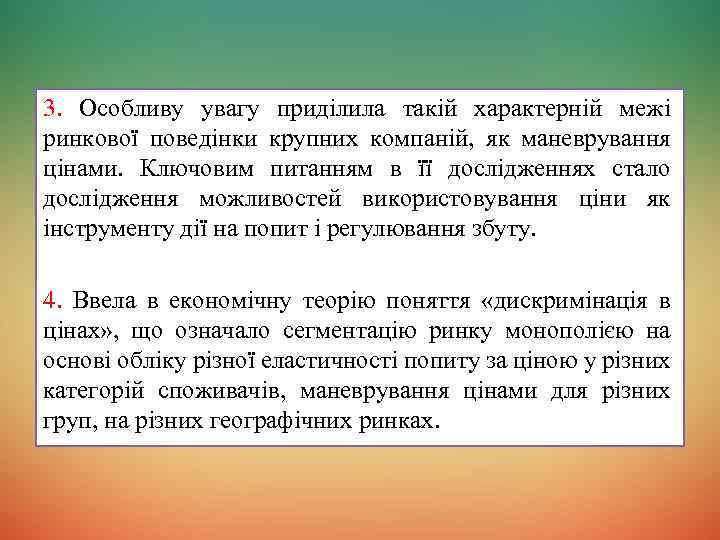 3. Особливу увагу приділила такій характерній межі ринкової поведінки крупних компаній, як маневрування цінами. Ключовим питанням в її дослідженнях стало дослідження можливостей використовування ціни як інструменту дії на попит і регулювання збуту. 4. Ввела в економічну теорію поняття «дискримінація в цінах» , що означало сегментацію ринку монополією на основі обліку різної еластичності попиту за ціною у різних категорій споживачів, маневрування цінами для різних груп, на різних географічних ринках.