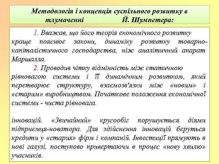 Методологія і концепція суспільного розвитку в тлумаченні Й. Шумпетера: 1. Вважав, що його теорія економічного розвитку краще пояснює закони, динаміку розвитку товарнокапіталістичного господарства, ніж аналітичний апарат Маршалла. 2. Проводив чітку відмінність між статичною рівновагою системи і її динамічним розвитком, який перетворює структуру, взаємозв'язки між «новим» і «старим» виробництвом. Початкове положення економічної системи - чиста рівновага. інновацій. «Звичайний» кругообіг порушується діями підприємця-новатора. Для здійснення інновацій беруться кредити у «старих» фірм і компаній. Інвестиції прямують в нові галузі, поступово привертаючи в процес «нову хвилю» учасників.