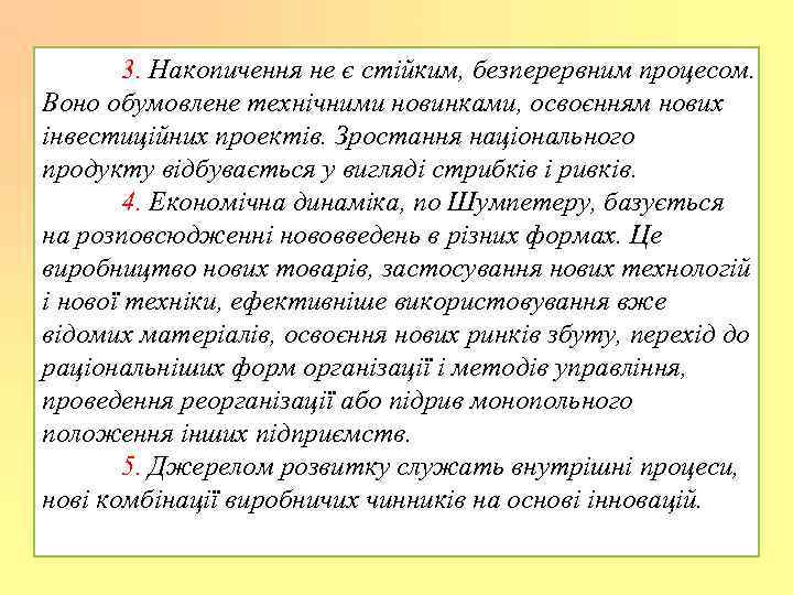 3. Накопичення не є стійким, безперервним процесом. Воно обумовлене технічними новинками, освоєнням нових інвестиційних проектів. Зростання національного продукту відбувається у вигляді стрибків і ривків. 4. Економічна динаміка, по Шумпетеру, базується на розповсюдженні нововведень в різних формах. Це виробництво нових товарів, застосування нових технологій і нової техніки, ефективніше використовування вже відомих матеріалів, освоєння нових ринків збуту, перехід до раціональніших форм організації і методів управління, проведення реорганізації або підрив монопольного положення інших підприємств. 5. Джерелом розвитку служать внутрішні процеси, нові комбінації виробничих чинників на основі інновацій.