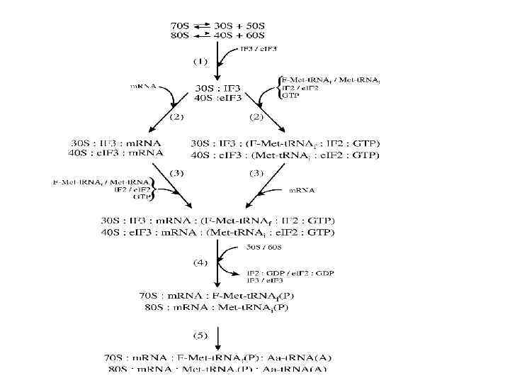 Білкові фактори ініціації трансляції у прокаріотів IF (Initiation Factor) • IF 1 - Mm 9 к. Да. Бере участь у дисоціації/асоціації рибосом на початкових стадіях ініціації, стабілізації зв'язків 30 S субодиниці з іншими факторами та формілметіоніл-т. РНКф. Meт • IF 2 - Mm 95 к. Да. Головний білковий фактор ініціації, має спорідненість до ГТФ, в комплексі з яким взаємодіє з 30 S субодиницею та формілметіоніл-т. РНКф. Meт , утворюючи ініціаторний 30 S -комплекс: 30 S· м. РНК· ф. Мет-т. РНКф. Meт ·IF 2· ГТФ • IF 3 - Mm 22 к. Да. Сприяє дисоціації 30 S і 50 S субодиниць- залученню IF 2 та вірній постановці ф. Мет-т. РНКф. Мет в Р-сайт рибосоми