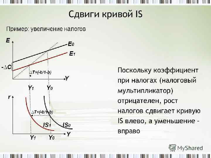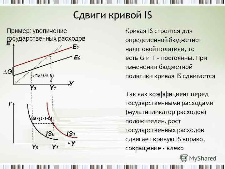 Сдвиги кривой IS Происходят, когда изменяется любой компонент планируемых расходов (или, другими словами, совокупного спроса) при неизменной ставке процента, например: Потребительские расходы (за счет изменения автономного потребления или налогов) • Автономные инвестиции • Государственные закупки товаров и услуг