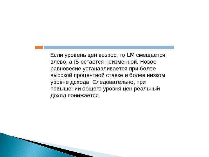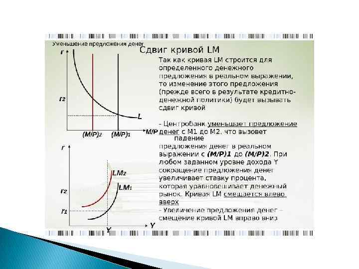 Факторы сдвига LM Субъекты экономики Причины изменения поведения Изменения параметров рынка денег Сдвиг LM Фирмы Ожидаемые расходы и доходы Увеличение (уменьшение) спроса на деньги Вниз (вправо) или вверх (влево) Домохозяйства Темпы инфляции Увеличение (уменьшение) спроса на деньги) Вниз (вправо) или вверх (влево) Государство Активизация ДКП Увеличение (сокращение) предложения денег Заграница Изменение доходности финансовых вложений