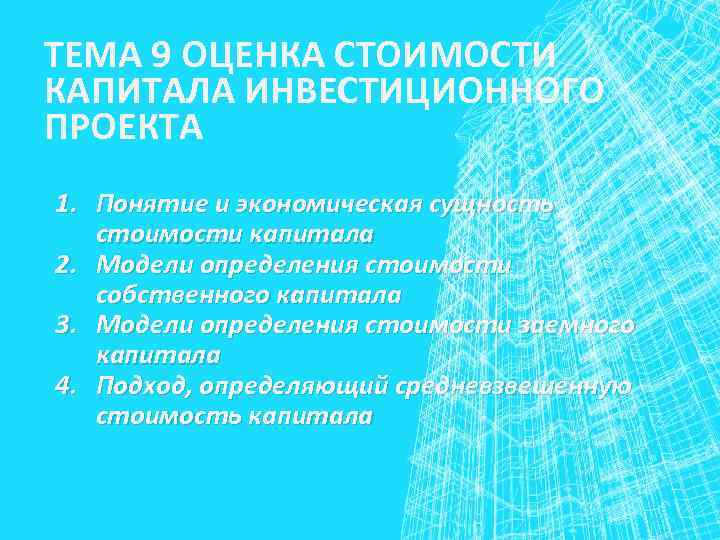 ТЕМА 9 ОЦЕНКА СТОИМОСТИ КАПИТАЛА ИНВЕСТИЦИОННОГО ПРОЕКТА 1. Понятие и экономическая сущность стоимости капитала 2. Модели определения стоимости собственного капитала 3. Модели определения стоимости заемного капитала 4. Подход, определяющий средневзвешенную стоимость капитала