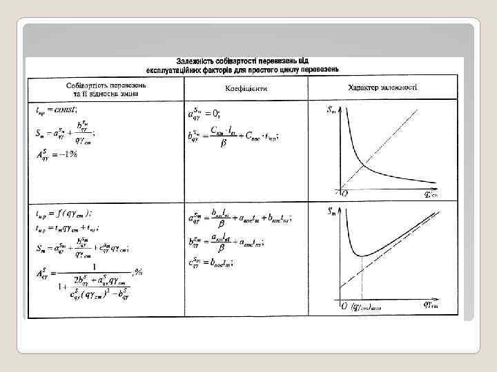 9. 4. Факторне дослідження собівартості перевезень на розвізних маршрутах 9. 4. 1. Вплив ступіня використання вантажопідйомності автомобіля при розвозі на собівартість перевезення 1 тонни вантажу, тобто Як і при аналізі впливу ТЕП на годинну продуктивність автомобіля або собівартість перевезення 1 тонни вантажу при виконанні ним простого циклу перевезень, в першу чергу необхідно привести вираз Sт для визначення її на розвізних маршрутах до вигляду однієї із функцій - лінійної або дробно-лінійної. Ми не будемо виконувати усіх перетворень, як ми це робили у попередніх аналізах для простого циклу перевезень, тому що вони досить громіздкі, а зразу графічно визначатимемо характер залежностей між показником та величиною Sт для розвізних маршрутів. Залежність між Sт та ступенем використання вантажопідйомності автомобіля при розвозі є дробно-лінійною. Висновок: Залежність собівартості перевезення 1 тонни вантажу на розвізних маршрутах від ступіня використання вантажопідйомності при розвозі - дробно-лінійна, представлена гіперболою. Із збільшенням значення ступіня використання вантажопідйомності автомобіля при розвозі до певної межі значення Sт зменшується. Але після певного значення цього показника, якому можна надати визначення як оптимальне значення, величина собівартості збільшується.